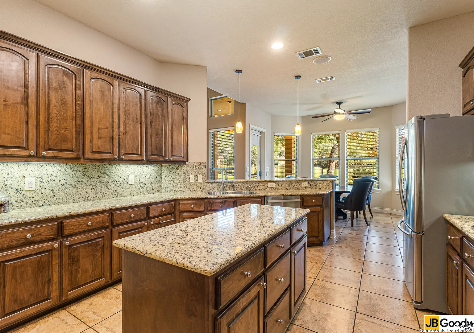 Estancia’nın kapalı alanında, Heights at Stone Oak’ta bulunan .29 dönümlük yeşil alan üzerinde yer alan şık, tek katlı özel Mallorca planı. Bu 279 m² alana sahip evde, her biri özel banyolu 3 yatak odası, bir çalışma odası ve yarım banyo bulunmaktadır. Yüksekliği 3 metreyi aşan tavanlar, yuvarlatılmış köşeler ve her yerdeki tasarım karoları zamansız bir arka plan oluşturuyor. Geniş oturma odasında, tavandan tabana taş şömine ve pencereler bulunuyor. Şef mutfak, granit tezgahlar, gazlı ocak, tava doldurma, büyük ada, taçlı özel meşe dolapları ve kiler ile donatılmış. Özel ebeveyn süiti, veranda erişimi, çift lavabo, jakuzili küvet, çerçevesiz duş ve geniş bir elbise odası içeriyor. İyileştirmeler arasında sert akçaağaç dolaplar, uzatılmış kapalı veranda, gelecekteki sıcak küvet için özel bağlantı ile veranda/gazebo, granit arka backsplashler, geliştirilmiş sıhhi tesisat/aydınlatma, ters ozmos su sistemi ve ses sistemi kablolaması bulunuyor. Enerji verimliliği özellikleri arasında çift HVAC, düşük E camlar, PEX sıhhi tesisatı ve geniş bir garaj yer alıyor. Mahalle olanakları: güvenlikli kapı, güvenlik devriyesi, Olimpik tarzda havuz, tenis & basketbol sahaları, kum voleybolu ve NEISD okulları.