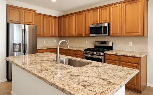 Güzel bir şekilde güncellenmiş mutfak, yepyeni geniş bir merkezi ada, granit tezgahlar ve ...